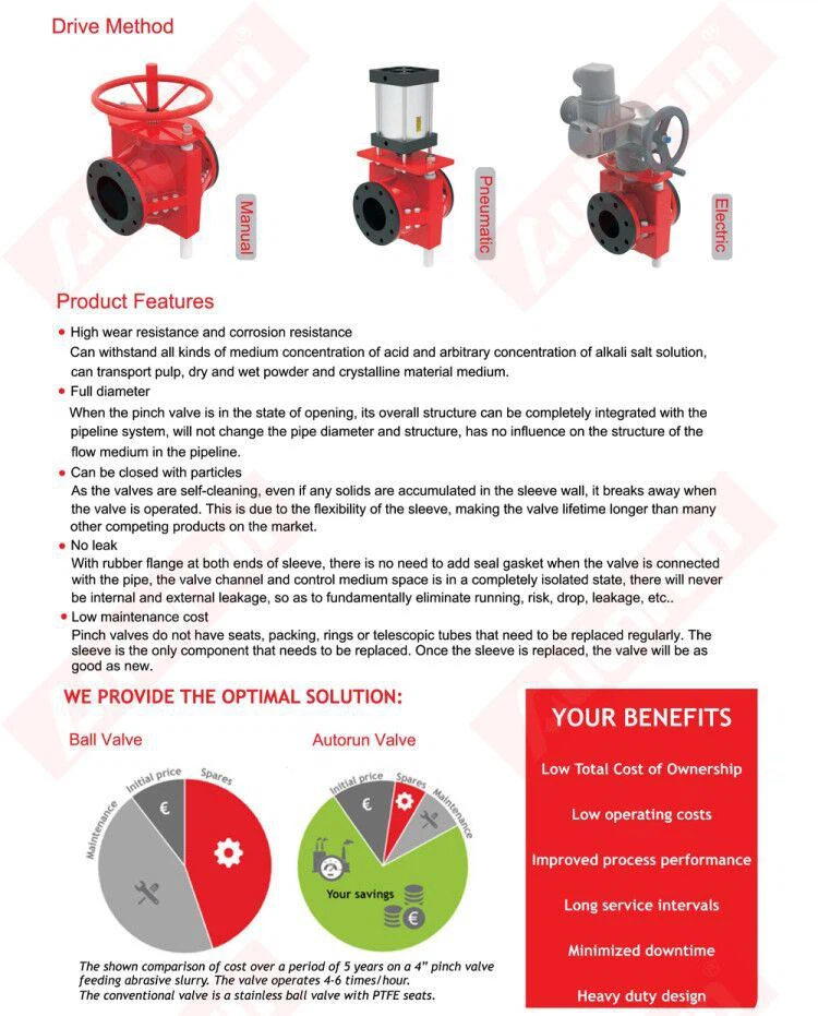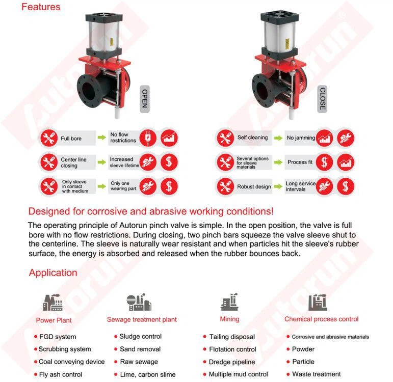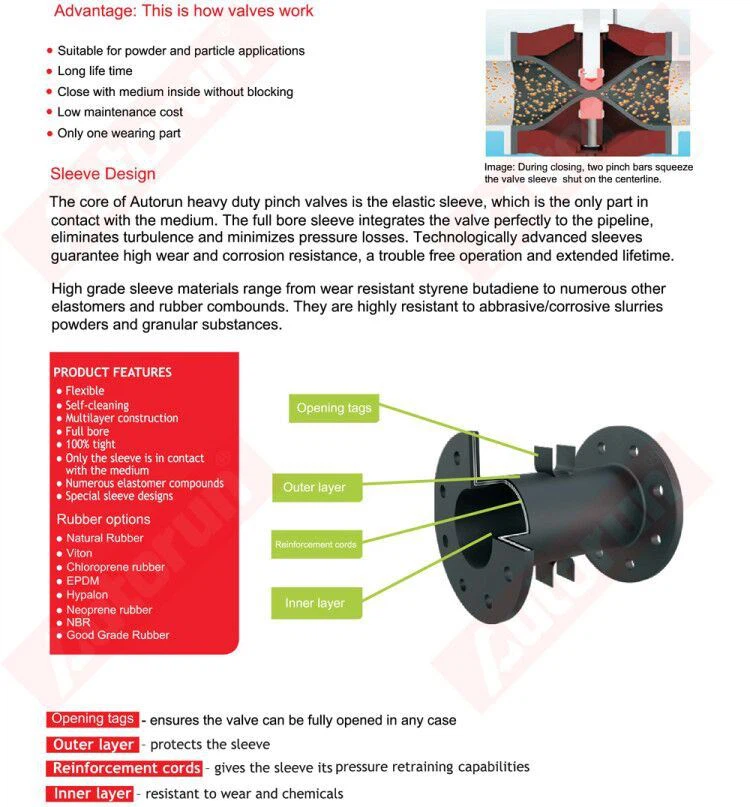 Le principe de fonctionnement de la vanne à manchon Autorun est simple. En position ouverte, la vanne est pleinealésage sans restriction de débit. Pendant la fermeture, deux barres de pincement serrent le manchon de valve pourla ligne médiane. Le manchon est naturellement résistant à l'usure et lorsque des particules frappent le caoutchouc du manchon GGsurface, l'énergie est absorbée et libérée lorsque le caoutchouc rebondit.